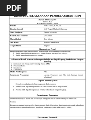 RPP B Indonesia - Deep Learning. Dokumen ini adalah Rencana Pelaksanaan Pembelajaran (RPP) untuk mata pelajaran Bahasa Indonesia di SMP Negeri Madani Pekanbaru, yang berfokus pada struktur teks ulasan. Tujuan pembelajaran mencakup kemampuan peserta didik untuk mengidentifikasi dan menjelaskan struktur teks ulasan, dengan pendekatan Problem Based Learning (PBL). RPP ini juga mencakup persiapan, kegiatan pembelajaran, asesmen, serta pengayaan dan remedial bagi peserta didik.