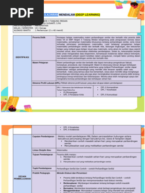 RPP Deep Learning kelas 7 PERBANDINGAN SENILAI. Dokumen ini adalah rencana pembelajaran matematika untuk kelas VII di SMP Negeri 3 Tanjung Medan, yang berfokus pada materi perbandingan senilai dan berbalik nilai. Pembelajaran dirancang menggunakan metode Problem Based Learning (PBL) dan melibatkan diskusi serta presentasi untuk meningkatkan keterampilan berpikir kritis dan kolaborasi siswa. Tujuan utama adalah agar siswa dapat memberikan contoh dan menyelesaikan soal yang berkaitan dengan perbandingan senilai dalam kehidupan sehari-hari.