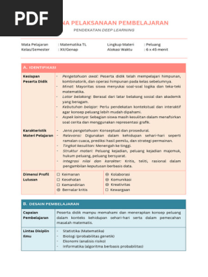 Rpp Deep Learning Matematika Xii - Peluang. Dokumen ini adalah Rencana Pelaksanaan Pembelajaran untuk mata pelajaran Matematika dengan fokus pada konsep peluang untuk kelas XII. Pembelajaran menggunakan pendekatan Problem Based Learning dan melibatkan berbagai disiplin ilmu serta teknologi digital. Tujuan utamanya adalah agar siswa dapat memahami dan menerapkan konsep peluang dalam kehidupan sehari-hari serta menyelesaikan masalah matematis terkait peluang.
